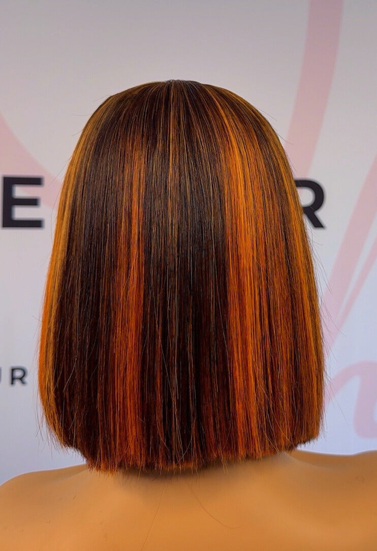 Trendy & Striking – A modern twist on classic brunette, featuring a warm auburn face-framing highlight. This striking contrast creates a dimensional, eye-catching effect, perfect for adding a touch of warmth and vibrancy to your everyday look. The perfect mix of bold & subtle.